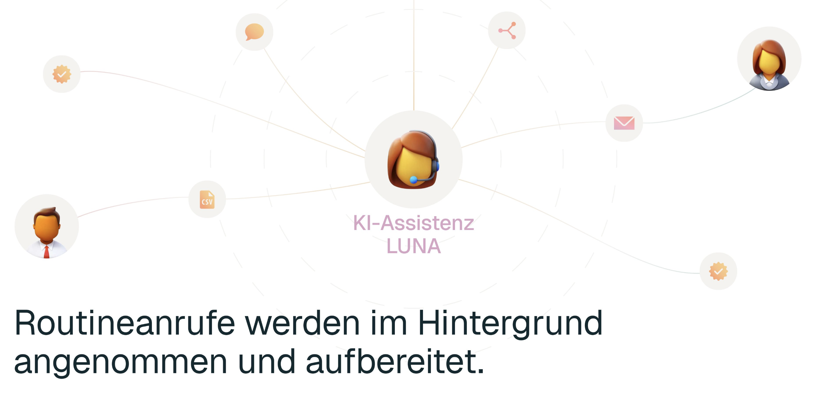 1. Sofortige Belohnung für den Anrufer: Niemand wartet gern. Luna geht sofort ran. 24/7. Das senkt den Stresspegel beim Kunden und im Team des Unternehmens massiv.