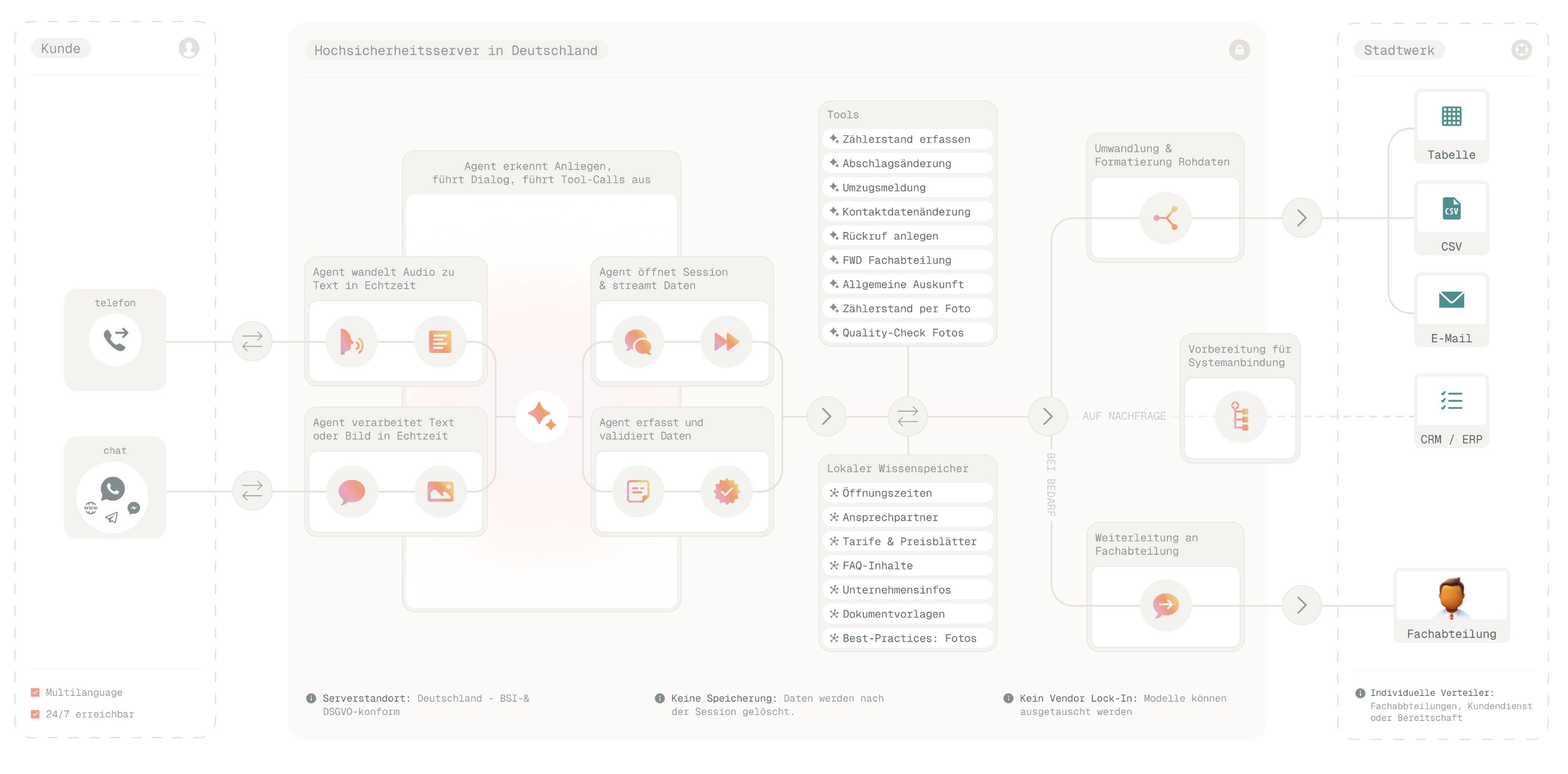 3. Datenschutz als Vertrauensanker: In Zeiten von DSGVO ist KI ein sensibles Thema. Wir haben Luna so gebaut, dass Gespräche auf Hochsicherheitsservern in Deutschland laufen. Es werden keine Audioaufnahmen dauerhaft gespeichert, sondern nur die relevanten Daten strukturiert übergeben.